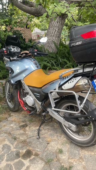 Moto BMW F 650 GS estilo trail, con motor rotax y transmisión manual. Ideal para aventuras. - Asiento de color mostaza. - Maleta trasera negra. - Protector de motor rojo. Actualmente esta dada de baja temporal pero la reabilitaria para su venta . 52000 km , vendo por exceso de motos