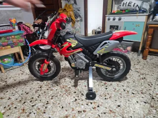 Moto negra en buen estado. - Diseño deportivo. - Manillar con puños azules. - Pegatina decorativa en el frontal. Le arreglado muchas cosas esta en perfecto estado y me gustaria cambiarlo por un minicoche o de marchas