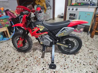 Moto eléctrica infantil de color rojo, ideal para los más pequeños. - Diseño deportivo. - Ruedines de apoyo para mayor estabilidad. - Asiento cómodo.