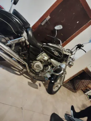 Moto custom de color negro, con un diseño clásico y elegante. Perfecta para disfrutar de la carretera. - Alforjas laterales negras. - Asiento doble. - Cromados en manillar y motor.