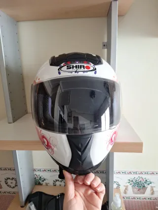 Casco de moto con un diseño llamativo y colorido. - Color blanco base. - Decoración con motivos abstractos y florales en tonos rosas, morados y naranjas. - Visera transparente. Talla XS