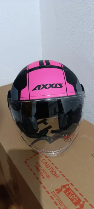 Casco tipo jet de la marca Axxis, con un diseño moderno en negro y rosa. - Color principal: rosa. - Detalles en negro y gris. - Visera transparente. - Talla XS