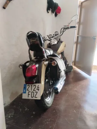 Moto estilo cruiser Daelim 125 en tonos beige y marrón. - Cambio manual. - Diseño clásico. - Ideal para disfrutar de la carretera.