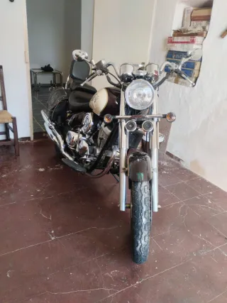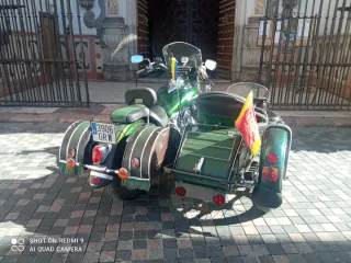 Moto custom Kawasaki Vulcan 1600 con sidecar de fabricación rusa. - Motor V-Twin de 1600cc. - Transmisión manual. - Estilo cruiser. - Color verde y detalles en marrón.
