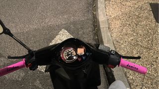 Scooter Yamaha Jog R en color negro. Con transmisión automática. - Puños de manillar en color rosa. - Espejo retrovisor. - Rueda delantera con dibujo marcado. -entera de serie -itv hasta 2027 -cambio por otra jog preoarada con itv en vigor hasta 2027