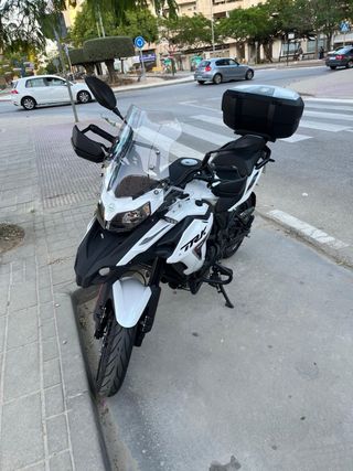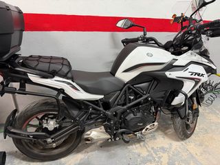 Moto Benelli TRK 502 en colores blanco y negro. Año: 07/2024 Kilometros: 11.000 Garantía oficial hasta 2029. Se vende con herrajes de maletas lateral SHAD y parrilla central SHAD (maletas no incluidas)