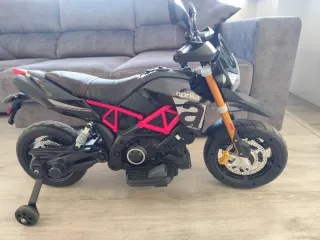 Moto eléctrica infantil con diseño deportivo de Aprilia. - Ruedines de apoyo para mayor estabilidad. - Diseño inspirado en motos de cross. - Acabado en negro con detalles rojos y blancos. - en perfecto estado, totalmente nueva. Sin uso . -el único desperfecto que tiene son los retrovisores, que al montarlos se rompieron .. por lo demás la moto es totalmente nueva .. sin uso . - tiene luz , música , y diferentes sonidos