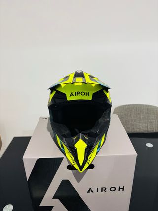 Casco Airoh de talla M, diseñado para motocross o enduro. - Color amarillo fluorescente y negro. - Visera integrada. - Interior acolchado para mayor comodidad. - Utilizado 1 vez - 0 caidas