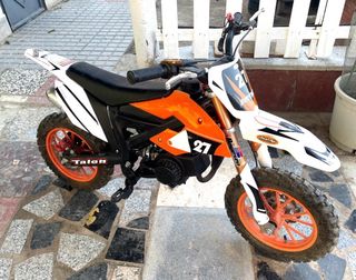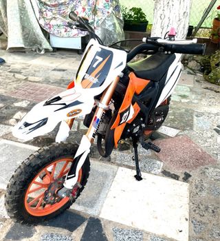 Mini moto de cross para niños, ideal para iniciarse en el mundo del motocross. - Diseño deportivo en naranja y blanco. - Ruedas todoterreno para mayor agarre. - Manillar con puños de goma para un mejor control.
