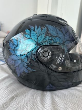 Casco integral SHARK modelo Ridill Nelum, diseño negro con detalles florales en tonos azul/morados. Pantalla ahumada instalada y mecanismo de ventilación frontal. Interior en excelente estado, acolchados limpios y sin desgaste visible. Casi sin uso, sin golpes ni caídas.