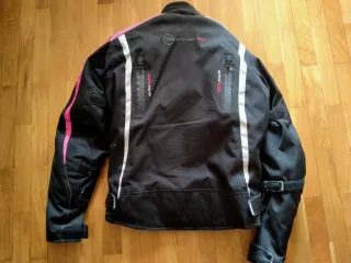 Chaqueta de moto con detalles en rosa y blanco. Diseñada para ofrecer comodidad y estilo. Talla L de adolescente. Sería tb talla S de mujer o así - Color principal: negro. - Detalles: rosa y blanco. - Sistema Air Flow.