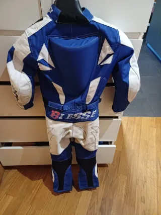 Traje de minimoto BIESSE de una pieza en color azul y blanco. - Diseño deportivo. -Espaldera - Cierre de cremallera frontal. - Detalles en blanco y negro. -Talla XS equivalente a 7 años -Usado de enero a noviembre -Buen estado aunque con alguna marca de uso (ver fotos)