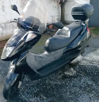 Scooter Honda de 250 cc, del año 2009, en color negro, super práctica y manejable para el día a día. ITV bianual hasta julio de 2026. Consumo mínimisimo. Rueda trasera nueva y delantera al 70%. Aceite recién cambiado, pastillas de freno nuevas y escobillas motor arranque nuevas. Baúl trasero para un casco, además del maletero bajo el asiento. 57500kms y los que la quedan!!! 999€ NO NEGOCIABLES, no me corre prisa. Un saludo!