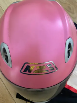 Casco de moto rosa y plateado