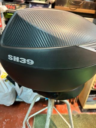 Baúl trasero para moto marca SHAD, modelo 39Incluye la parrilla de montaje. - Diseño en color negro con acabado imitación carbono. - Cierre con llave. - Luces traseras integradas.
