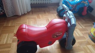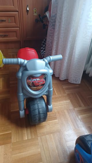 Moto de juguete con diseño de Cars. - Asiento rojo. - Ruedas negras. - Detalle frontal de Rayo McQueen.
