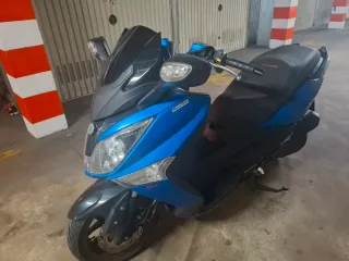 Suzuki Burgman 125 en color negro. lleva desde principios de año parada por no usar, habría que pasarle la ITV pero la pasa sin problema, neumáticos al 70% de vida, puños y batería nuevas, correa, rodillos y embrague del variador cambiados en noviembre del año pasado (no hizo 400km desde que se le hizo). Le cuesta arrancar en frío, habría que carburarla para que arranque bien, una vez que arranca ya arranca bien siempre y funciona correctamente