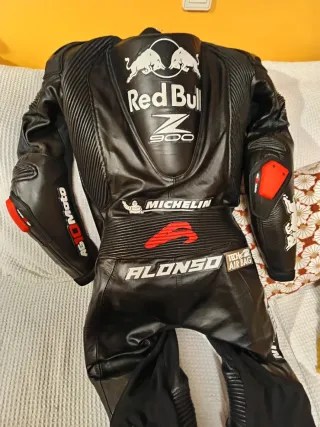 Mono de piel de canguro microperforada AG10. Incluye adaptación para chaleco airbag Alpinestar, también incluye sotomoto. Hecho a medida para persona de complexión delgada de 1'81, se puede cambiar la talla por la empresa. Impecable, muy bien cuidado. Tengo también el Airbag, por si interesa. - Diseño deportivo. - Combinación de colores negro y rojo. - Logos de Red Bull, Michelin y Alonso visibles.