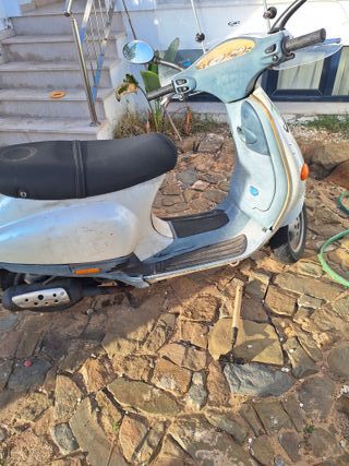 Vespa scooter en buen estado, con transmisión automática. - Color blanco y azul claro. - Diseño clásico. - Ideal para desplazamientos urbanos.