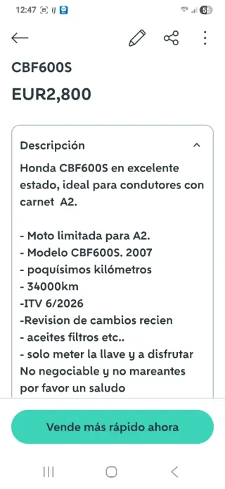 Honda CBF600S en excelente estado, ideal para condutores con carnet A2. - Moto limitada para A2. - Modelo CBF600S. 2007 - poquísimos kilómetros - 34000km -ITV 6/2026 -Revision de cambios recien - aceites filtros etc.. - solo meter la llave y a disfrutar