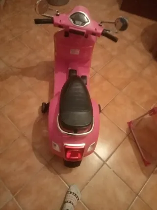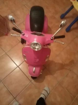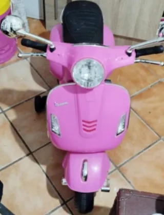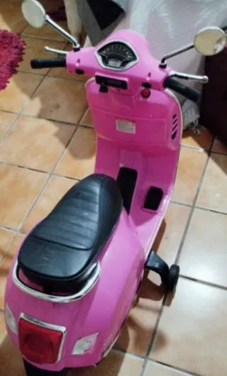 Moto eléctrica infantil que imita el diseño de una Vespa clásica. Ideal para los más pequeños. - Color rosa vibrante. - Asiento cómodo. - Ruedines para mayor estabilidad.