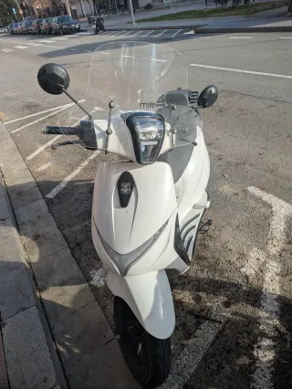Scooter Kymco Like 125 en color blanco, recién revisada, con 34.000km, del 2010, tiene etiqueta C para entrar en Barcelona y ITV vigente, está en buen estado, pero no está perfecta, funciona todo bien, tiene algún plástico ligeramente roto, nada grave. -Añadidos: puños calefactables, Cúpula, baúl y candado de manillar.