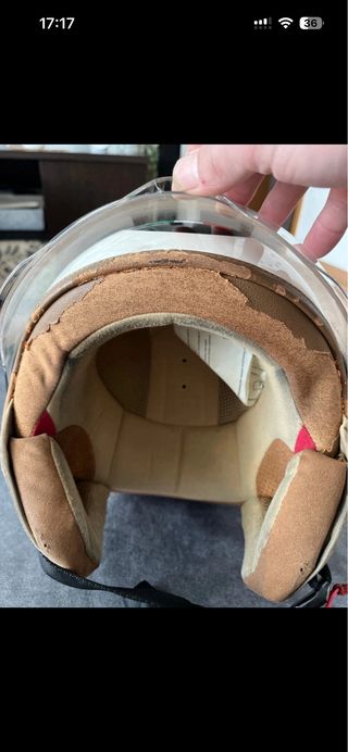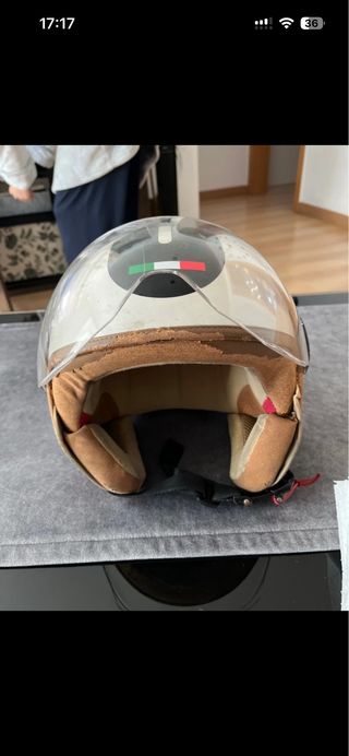 Casco jet de estilo scooter, perfecto para tus desplazamientos urbanos. Su diseño combina colores blanco y marrón para un look moderno. - Visera transparente. - Interior acolchado para mayor comodidad. - Cierre de seguridad. Usado con desgaste de guardar en el asiento