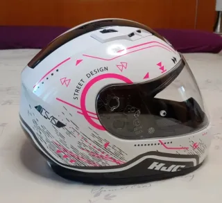 Casco de moto HJC CS-15 con un diseño moderno y llamativo. - Color blanco con detalles en rosa y negro. - Visera transparente. - Homologación E9 051191 0253.