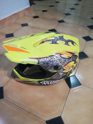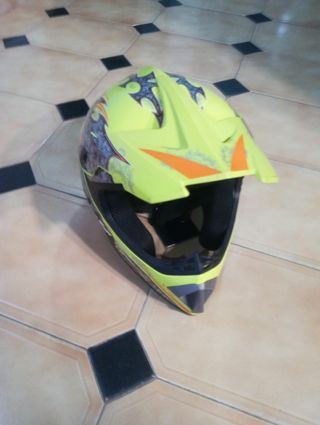 Casco de moto para cross, talla M. Diseño llamativo con gráficos. - Color amarillo. - Cierre de seguridad.