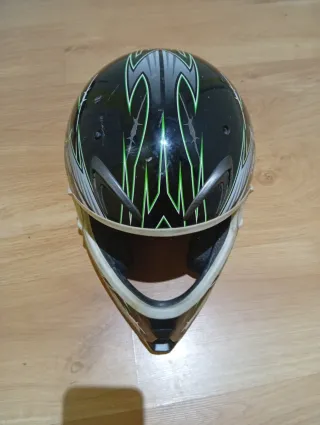 Casco de moto con un diseño llamativo en negro y verde. - Estilo enduro y motocross. - Cierre de seguridad.