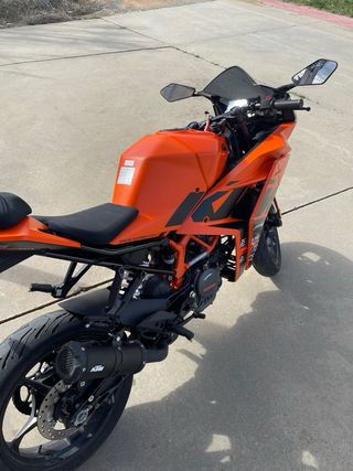 KTM RC 125 GP del año 2023. Apta para carnet A1/B. 125cc con 15cv y tiene 15.177 km Siempre ha dormido en garaje y funciona perfecta. Me la vendo porque no la uso. Tiene ITV y toda la documentación en vigor. Solo tuvo una caida lateral estando aparcada y tiene la cubierta de plastico del intermitente frontal izquierdo rota y unas pequeñas marcas en la pintura. La luz del intermitente funciona perfectamente y no es muy caro cambiarlo, podemos negociar el cambiarlo antes de venderla. En la penultima foto se puede ver todo claramente.