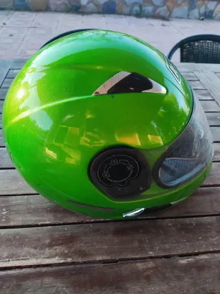 Casco de moto integral de color verde brillante con detalles plateados. Presenta el logo de la marca NZI en la parte frontal. - Color: Verde brillante - Marca: NZI - Diseño: Integral - Visera transparente - Buen estado, ningún golpe, algún arañazo de guardarlo en el baúl