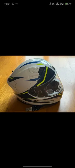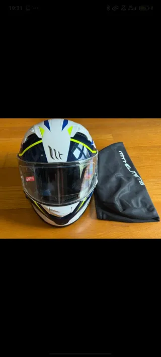 Casco de moto MT Helmets en talla M. Lo compré porque quería sacarme el carnet pero dure dos clases prácticas, ese es el uso que tiene el casco, dos clases de prácticas. Cualquier pregunta no dudes en hablarme. - Color blanco con detalles en azul y amarillo. - Visera transparente. - Incluye funda protectora.