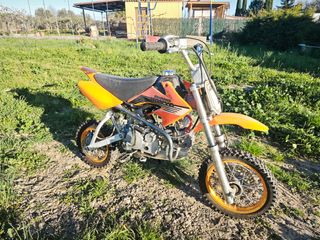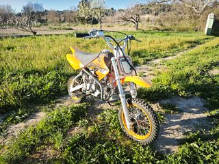 Minimoto pitbike de motocross china de la marca Honyo. Motor 150cc 4 tiempos de competición Bud Racing con radiador de aceite. Se cambió por el motor chino 125cc que llevaba, el 150cc apenas tendrá 40 o 50 horas de uso. Sólo el motor ya cuesta unos 700€. Lleva tiempo parada, hay que hacerle ajustes de carburación y limpieza o cambio de bujía.