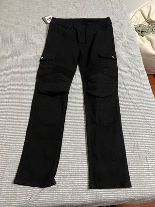 Pantalones vaqueros negros para motorista, de estilo cargo. Son de corte ajustado y tienen protecciones en las rodillas y en la cadera. Ideales para ir en moto. - Bolsillos cargo laterales. - Protecciones acolchadas en rodillas. - Diseño ajustado.