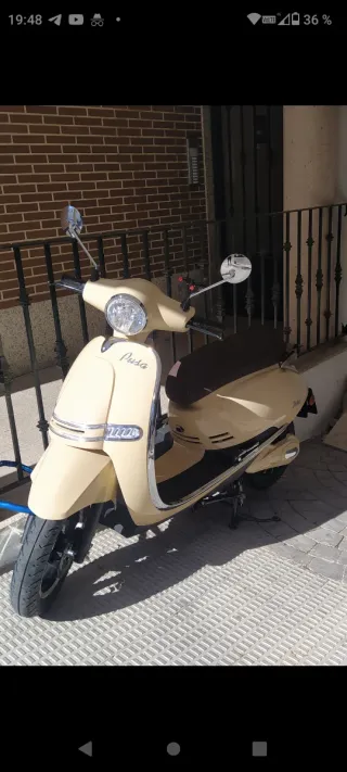 Vendo Moto eléctrica en color crema, con un diseño retro y elegante. Equivale a una moto de 125cc. Actualmente en uso y la moto va perfecta, se puede probar y llevar a cualquier taller, la vendo porque se me queda pequeña y quiero comprarme una mas grande. Tiene una autonomía de unos 100 km en ciudad a una velocidad tranquila, si la llevas con alegría y por vías rápidas tiene una autonomía de 60 km por carga. Su velocidad máxima real es de 86 km hora y según se va gastando la batería se queda a una velocidad máxima de unos 75 km hora. Actualmente en garantia, la batería de marca calt tambien estae garantia. 17000 km