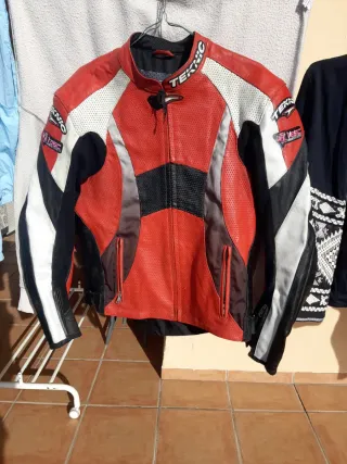 .Cazadora de moto de la marca TEKNIC. - Color rojo, negro y blanco,con refuerzos en codos espalda,hombros. En buenas condiciones, cremalleras perfectas nada roto,una limpieza e hidratación le vendria bien aunque se hidrató. Solo la tendré esta semana hasta el sabado.despues en 10 12 dias, por viaje. Estaré a partir del 17 hasta el 22 .