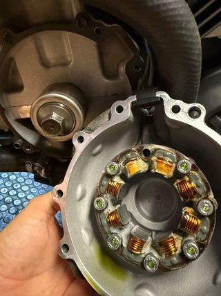 Plato de imanes aligerado para Kawasaki ZX10R, modelo 2016 en adelante. - Pieza de recambio para moto. - Diseño aligerado para mejorar rendimiento. En la primera foto se ve la diferencia del de serie (marcado en azul) y el aligerado (marcado en amarillo)