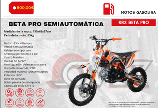 Prácticamente nueva. Mi hijo la ha usado 3 veces. Aún tiene los pelillos de las ruedas Moto Cross 125cc KRX BETA PRO KRX BETA PRO, pitbike de la última gama de KRX. Equipada con materiales de calidad para experimentar una sensación de conducción al límite. Moto cross 125cc KRX BETA PRO, equipada con un motor de 4 tiempos, perfecta para desafiar todo tipo de terrenos, alcanzando una velocidad máxima de hasta 100km/h gracias a los 12CV de potencia que presenta. Diseño exclusivo con cachas estilo CRF110. - Diseño deportivo en naranja y negro. - Ruedas de tacos para mayor agarre. - Manillar de cross para un control óptimo.