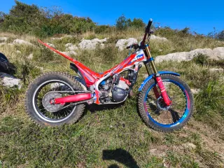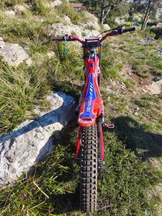 Moto de trial Beta Factory en color rojo y azul del año 2024. Moto muy fiable y perfecta para la perfección e iniciación del la práctica del trial o del enduro . Piezas de competición. - Chasis aluminio -Tijas en azul -Manillar marca S3 en rojo metal. - Suspensión delantera Paioli color dorada espectacular. -llantas azul metálico . Revisará y puesta a punto . Plásticos nuevos a estrenar . Puños Domino Racing. Muchos extras más. Matriculada . No se aceptan cambios