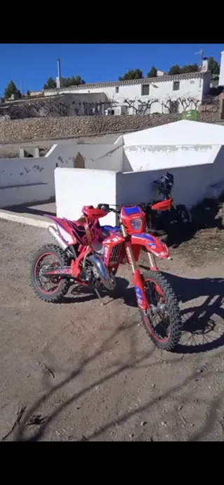 Moto de enduro Beta en colores rojo y negro. Diseñada para terrenos off-road. - Chasis tubular de acero. - Suspensión delantera Marzocchi. - Frenos de disco hidráulicos. - Ruedas mitas con mousse delante y detras -Cubrecarter original beta (100€) -homologada para 2 personas -Primera itv el 13/05/2026 -Cambio de aceite hecho 27/11/2025 con factura demostrable -kit de arraste hecho hace 10 meses -10462km =6501 millas -289horas -toda la documentacion en regla -Precio algo negociable #ktm#sherco#gasgas#enduro#fantic#125#4tiempos#moto#beta