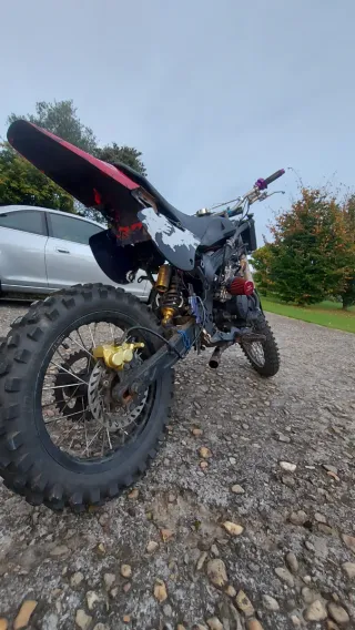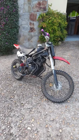 Vendo pit con motor de 250, anteriormente era una 140, ahora mismo hay que hacerle una tobera para el carburador, ponerle una pata de arranque o batería y el depósito es adaptado, tengo el de serie pero está rajado, seria para arreglar, en las ultimas fotos se muestra como estaba hace unos meses, pero la posicion del motor no era buena y la desmonté para corregirla. Ahora como tengo mas motos no tengo ganas de continuar con ella. Embragues nuevos, cilindro nuevo, radiador nuevo, encendido nuevo, motor de arranque nuevo, cableado nuevo, carburador 34mm pwk a falta de carburar, antes se ahogaba, puse chiclé mas grande y no pude probar