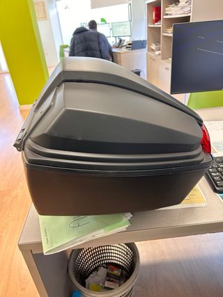 Baúl superior original de BMW para el modelo C 650 Sport. Diseñado para integrarse perfectamente con la estética de la moto. - Color negro mate. - Incluye luz trasera roja. - Logo BMW visible.