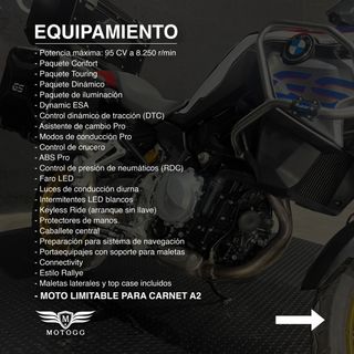 BMW F 850 GS ADVENTURE RALLYE Precio: 8690€ Año: 2020 Cilindrada: 853cc Potencia: 95cv Peso: 244kg Kilómetros: 40000 Garantía: 1 año Carnet: A/A2 Tienda: Terrassa Pegatina Medioambiental: C (verde) Se entrega completamente revisada y con itv al día. Entregamos en cualquier punto de la península a excepción de Portugal. Precio de envío a consultar. Al precio hay que sumarle 190€ de cambio de nombre. ¡¡Pero no te preocupes, que de la gestión nos ocupamos nosotros!! SERVICIOS MOTOSPLUS: - GARANTÍA EXTENDIDA - FINANCIACIÓN A MEDIDA - REVISIÓN PLUS+ - SERVICIO DE ENTREGA Y RECOGIDA A DOMICILIO - ASEGURAMOS TU NUEVA MOTO