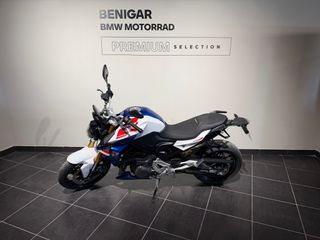 BMW F900R modelo 2024 con un diseño deportivo y moderno. - Estilo naked. - Combinación de colores azul y blanco. Equipamiento y extras: - Asistencia y confort: Control dinámico de freno motor, arranque confort, control de crucero, caballete central y puños calefactables. - Paquete Touring: Preinstalación para navegador (con soporte móvil integrado y carga), soporte para maletas. - Paquete Dinámico: Faros autoadaptables, Dynamic ESA, luz diurna y faro delantero Pro. -Paquete Activo (seguridad y rendimiento): Control dinámico de tracción (DTC), asistente de cambio Pro, modos de conducción. Acabado Sport: Colores BMW con spoiler y más