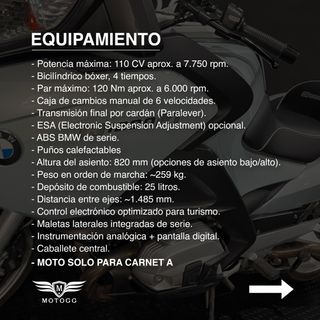 - Diseño deportivo con detalles en rojo, blanco y azul. - Incorpora maletas laterales y baúl trasero. - Radio original BMW. - ESA suspensión con tres modos. - ASC control de tracción - Asientos y puños calefactables. - Control de velocidad. - Escape akrapovic y original. - Pintura tricapa. - Asientos tapizados por Marquez. - Pantalla CarPlay. - Pantalla electrónica ahumada y otra transparente alzas - Todos los mantenimientos hechos y las ruedas nuevas. - Control de presión de neumáticos Moto a capricho, muy muy cuidada. No quiero cambios.