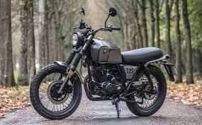 Motocicleta Brixton BX125 en color negro. Un modelo clásico con estilo. - Diseño retro. - Neumáticos de tacos. - Faro redondo. - Asiento de cuero negro.