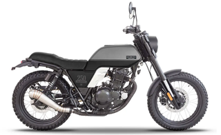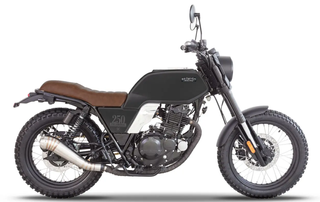 Moto Brixton 125cc en color negro mate. Diseño clásico y robusto. - Estilo scrambler. - Asiento de cuero negro. - Ruedas mixtas para asfalto y caminos. - Faro delantero con rejilla protectora.