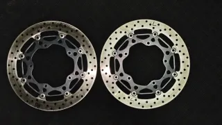 Discos de freno originales para Yamaha R1 modelo 2024. Piezas de serie en buen estado. - Se sustituyeron con apenas 450 Km - Diseñados para Yamaha R1. - Material de alta calidad. - Diseño perforado para disipación de calor.