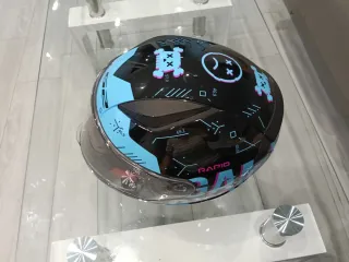 Casco de moto con un diseño llamativo y moderno. - Color base negro con detalles en azul y rosa. - Gráficos con estilo futurista y calaveras. - Visera transparente.